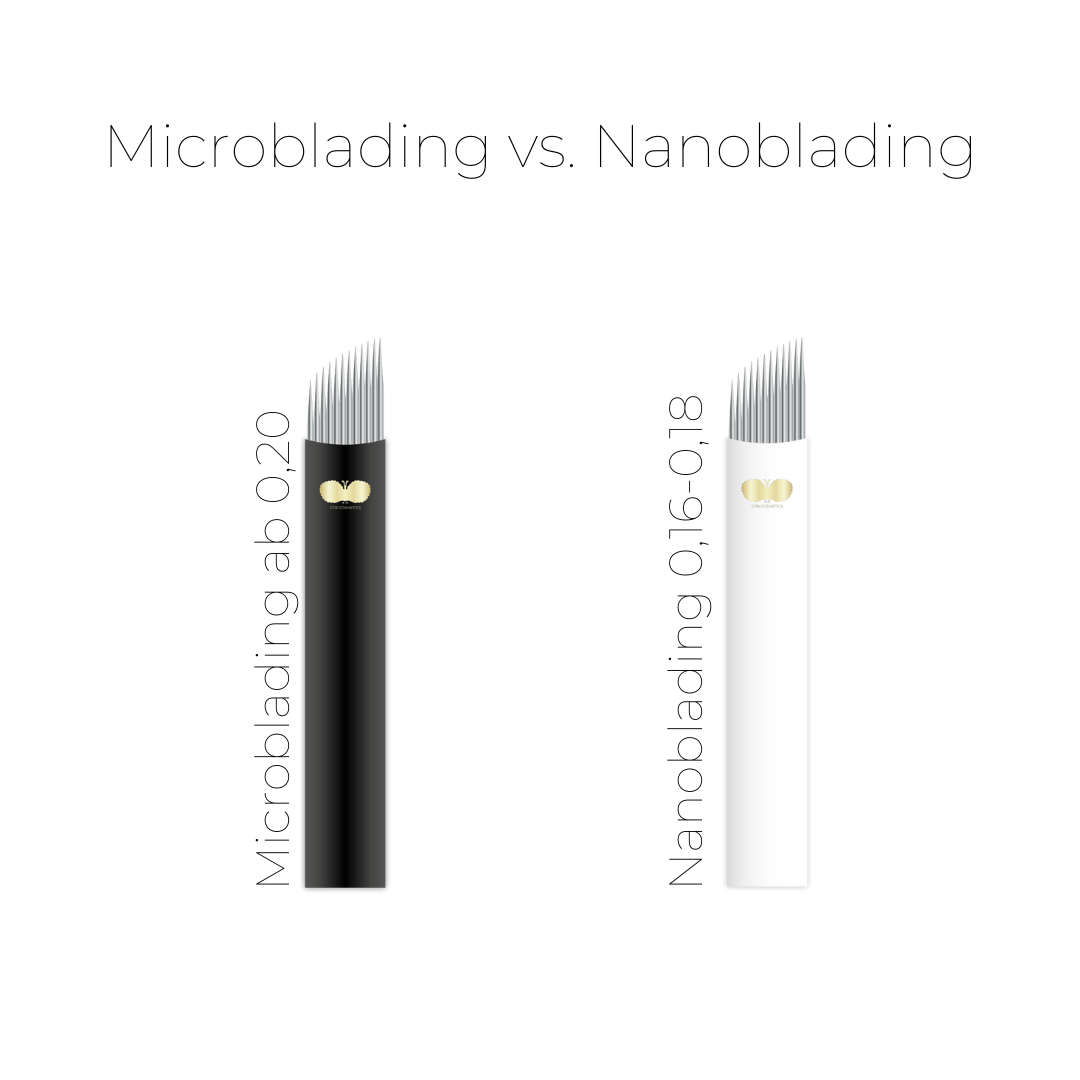 Nanoblading: Sehr dünne Nadeln, für extrem natürliche feine Härchen. Microblading: Etwas dickere Blades, für natürliche, aber vielleicht etwas kräftigere Härchen.