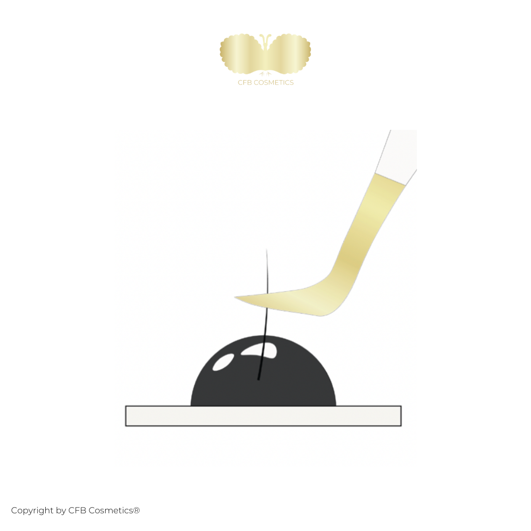 Um die Wimpernextension korrekt mit Kleber zu versehen, tauchen Sie diese sanft in den mittleren Bereich des Klebertropfens ein und ziehen Sie sie langsam heraus. Der zentrale Teil des Klebertropfens enthält den frischesten und leistungsfähigsten Kleber. Sollten Sie feststellen, dass die Extension zu viel oder zu wenig Kleber aufgenommen hat, tauchen Sie sie nochmals ein und ziehen Sie sie behutsam heraus, um die Menge zu justieren.