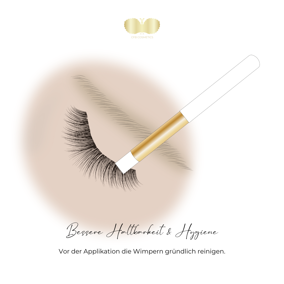 Verwenden Sie vor dem Anbringen von Neusets und bei Auffüllterminen unser Wimpernshampoo Lash & Brow Foam Luxury, um die Wimpern der Kundin gründlich zu reinigen. Nutzen Sie Reinigungsstäbchen, um Wimpern, Augenlid und den gesamten Augenbereich zu säubern. Spülen Sie mit Kochsalzlösung oder destilliertem Wasser ab, und achten Sie darauf, ein Kosmetiktuch am äußeren Augenwinkel zu platzieren, um ein Eindringen von Wasser in das Gesicht oder Ohr der Kundin zu verhindern.